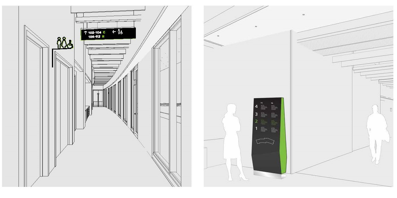A complete signage and wayfinding system was needed for this 190,000 sq. foot corporate campus. This project included code-compliant room signage, interior and exterior wayfinding signage, and glass graphics for offices, as well as conference and huddle rooms.